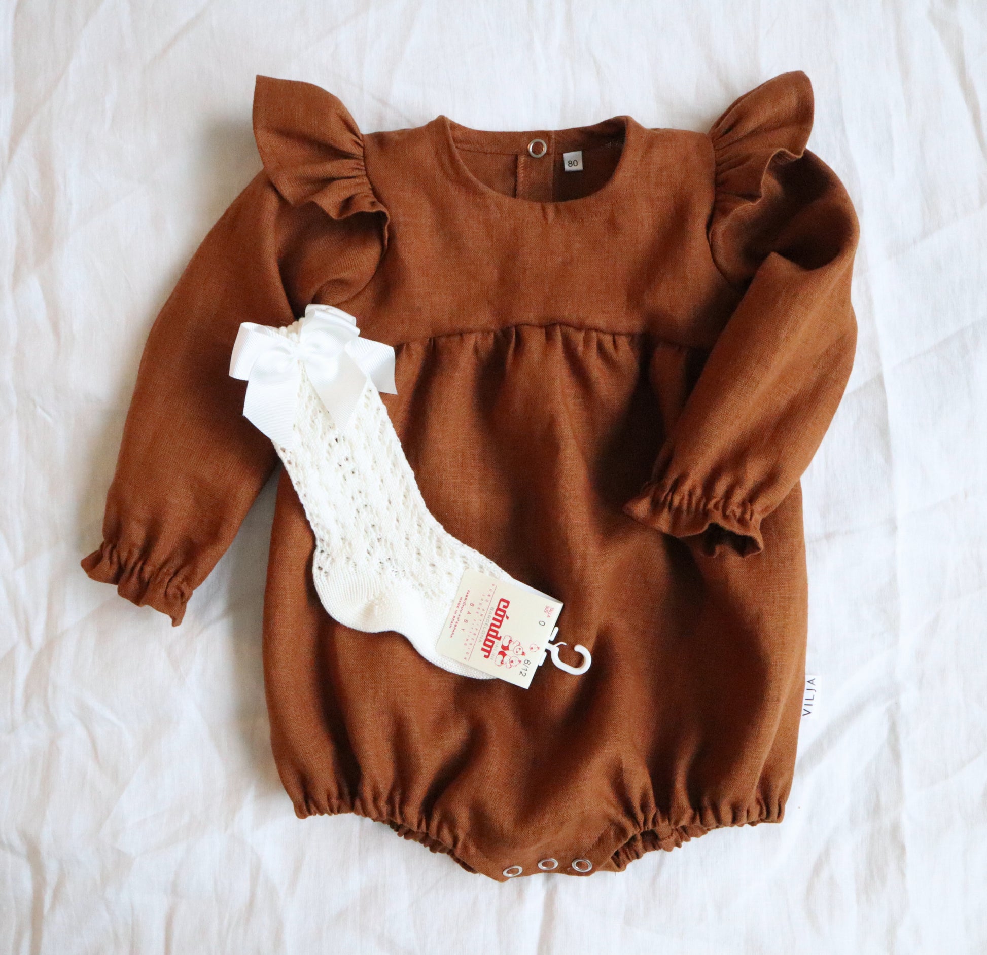 Ihastuttavan kaunis romper olkafrilloilla. Ranteessa kauniit rypytykset. Sävy kaneli, koko 62.