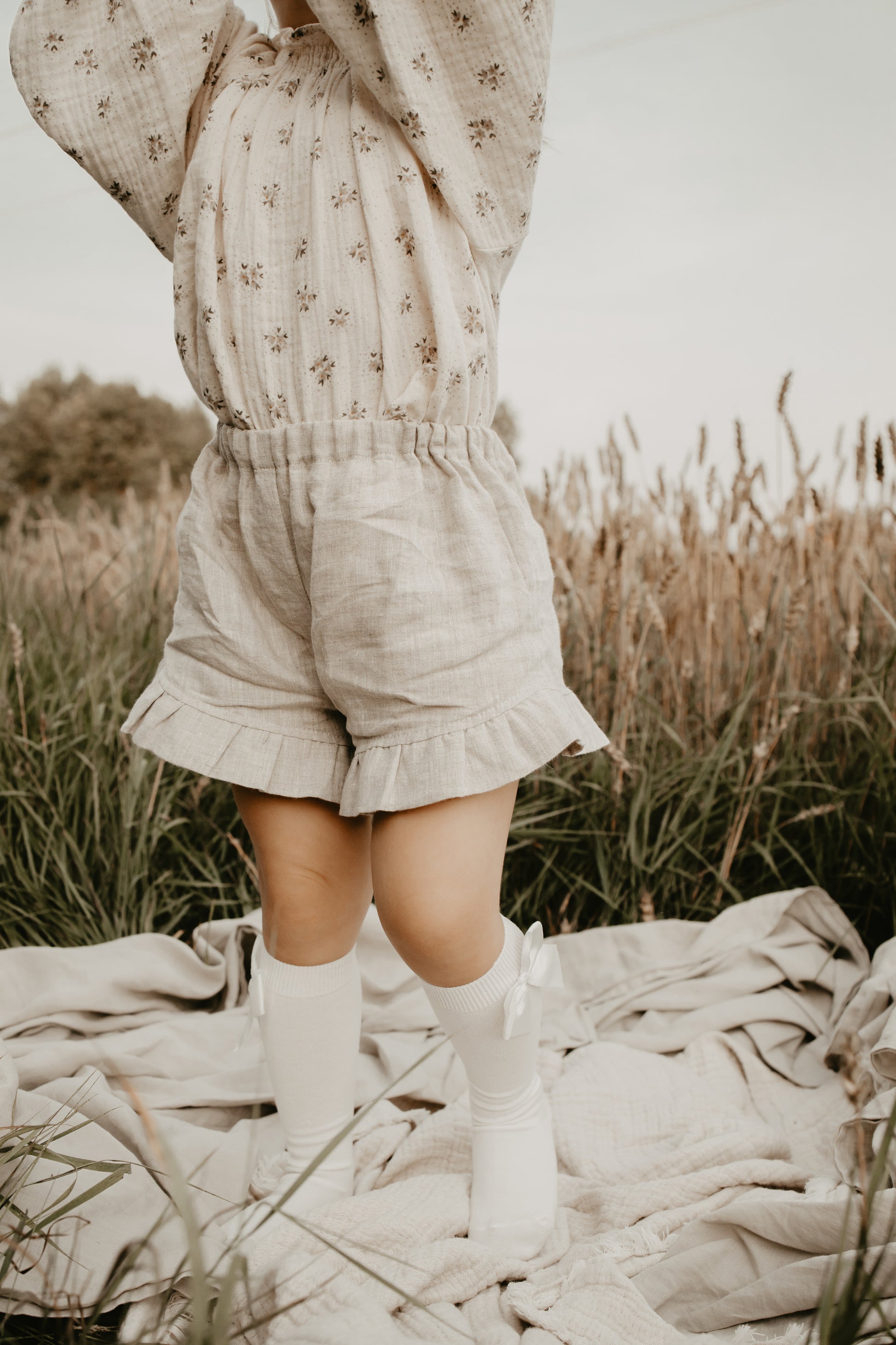 Kauniit frillashortsit pehmeällä vyötärökuminauhalla pellavakankaasta.