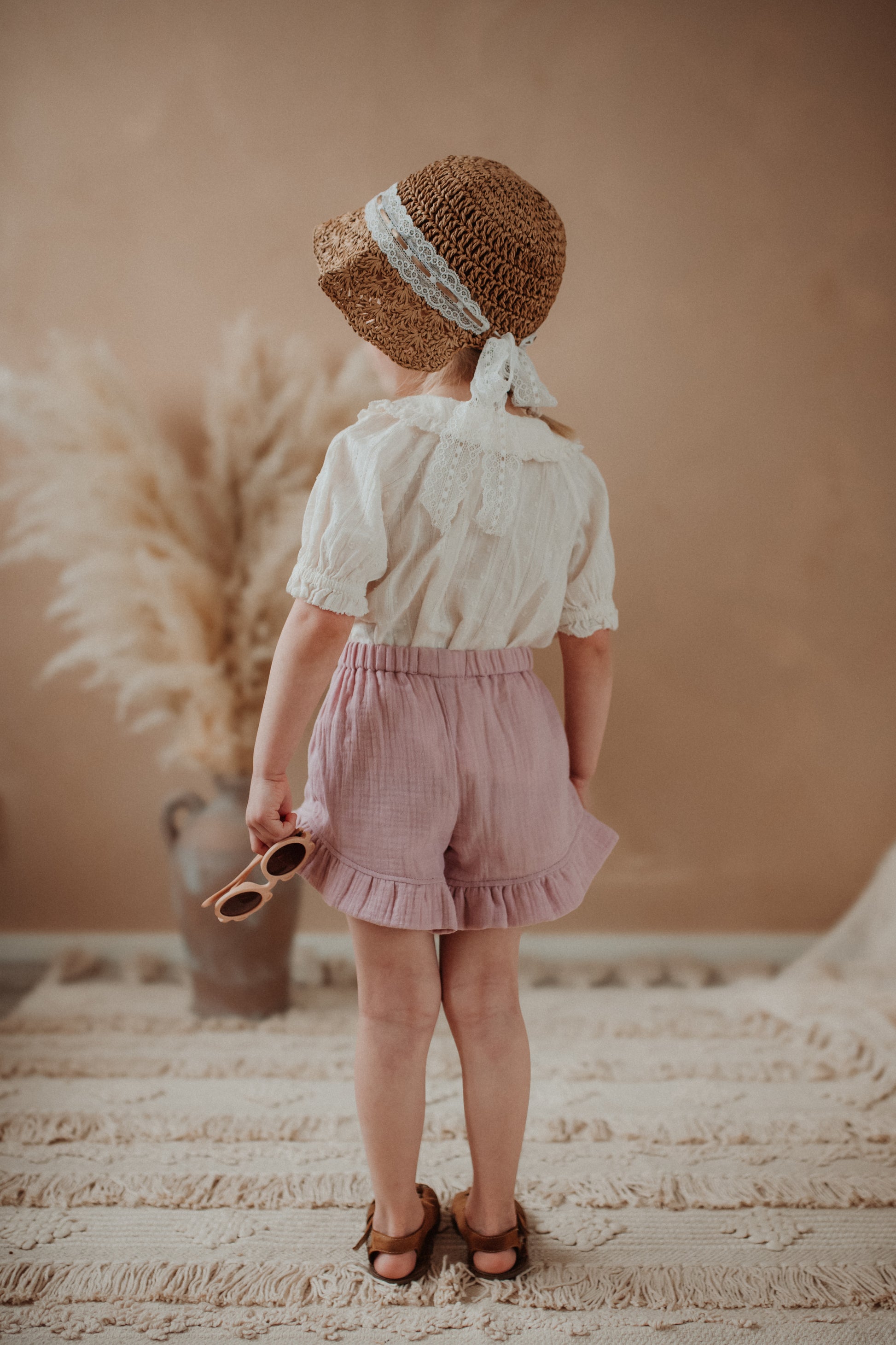 Kauniit frillashortsit pehmeällä vyötärökuminauhalla pehmeästä harsokankaasta.
