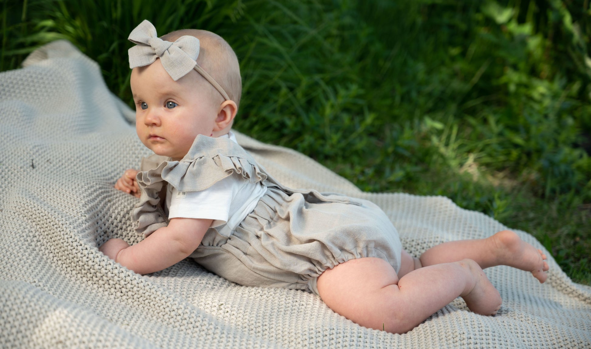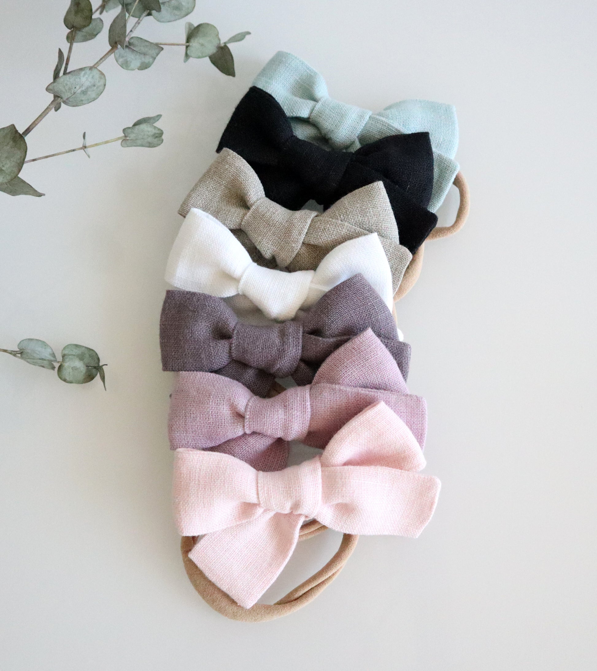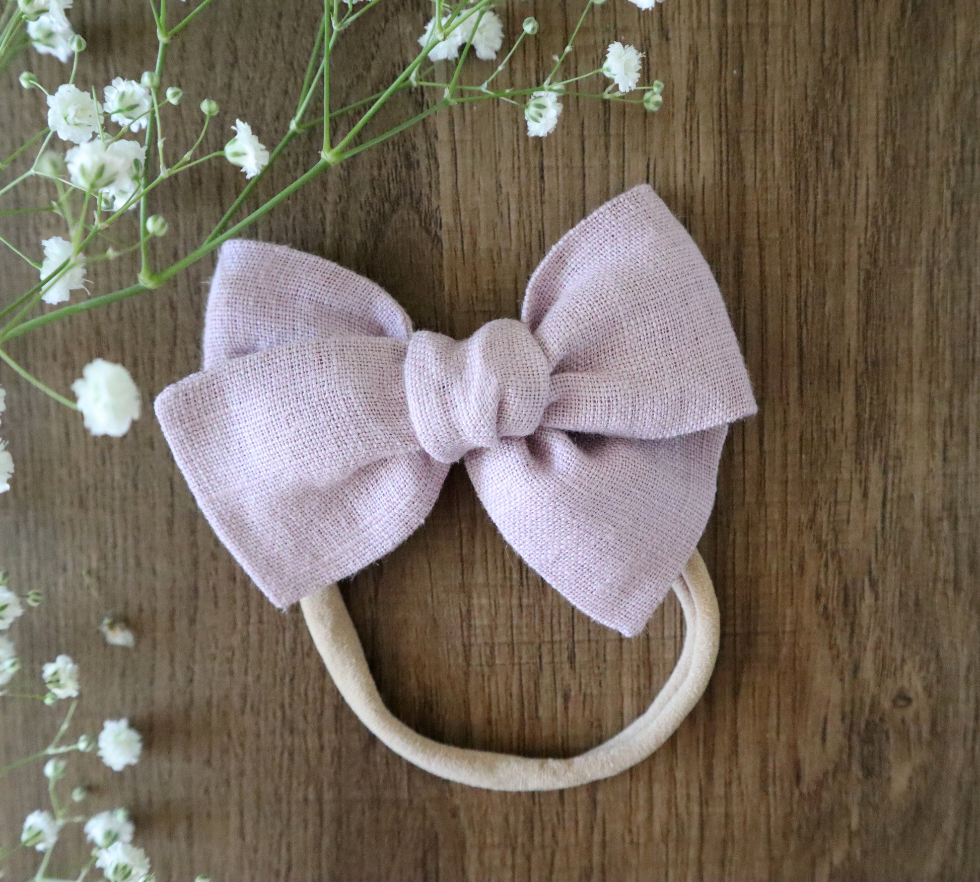 Suosittu rusetti kauniista pellavakankaasta pantana, klipsinä tai ponnarina. Kaunis rusetti on ihastuttava asuste kaikenikäislle. Nylonpanta on erittäin pehmeää ja venyvää materiaalia ja sopiva vastasyntyneestä aikuiselle. Valitse rusetin koko, panta on One size.