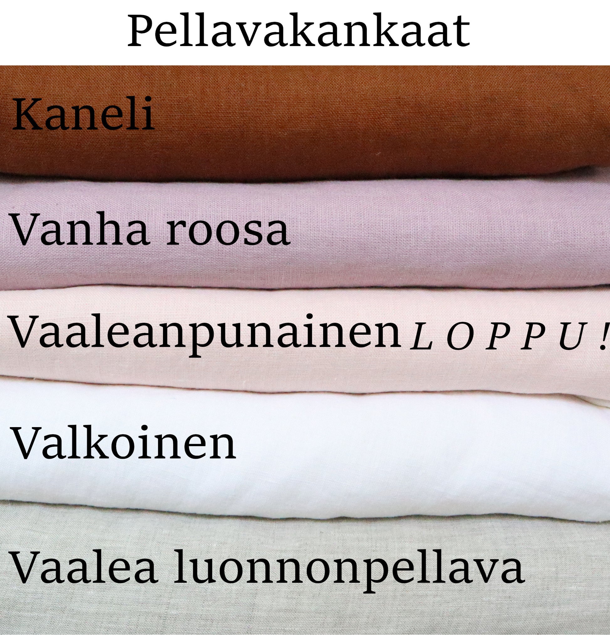 100% Pellava on ekologinen valinta vaatteen materiaaliksi. Pellava kestää hyvin kulutusta, hengittää ja imee kosteutta. Pellava tuntuu viileältä lämpimällä ilmalla ja lämpimältä viileällä ilmalla. Pellava hylkii likaa, ei nukkaannu ja itseasiaasa vain pehmenee ja paranee käytön myötä.